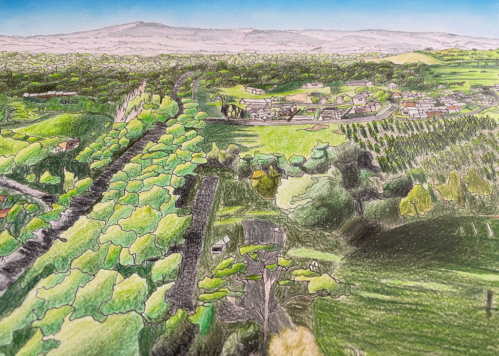 Charlie’s Macedon Ranges work is a tribute to his home town. Painstakingly drawn with pencil and dry pastel, the piece captures the tiniest of details and the view to the iconic Mount Macedon.